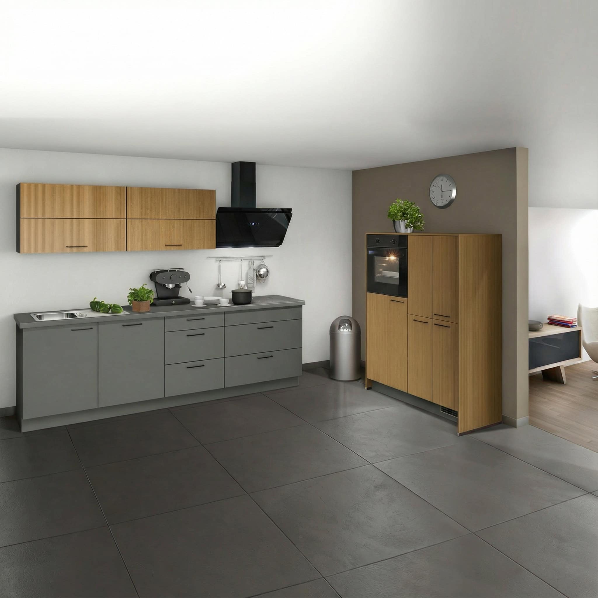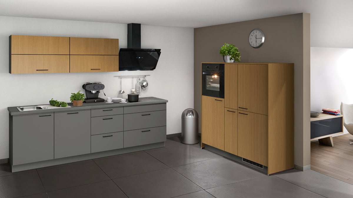 A nemes antracit és a világos tölgy lamellás előlapok designjától ez a konyha minden bizonnyal igazi figyelemfelkeltő.