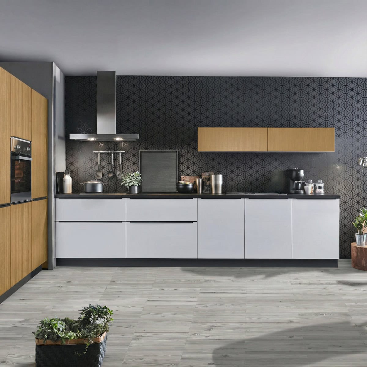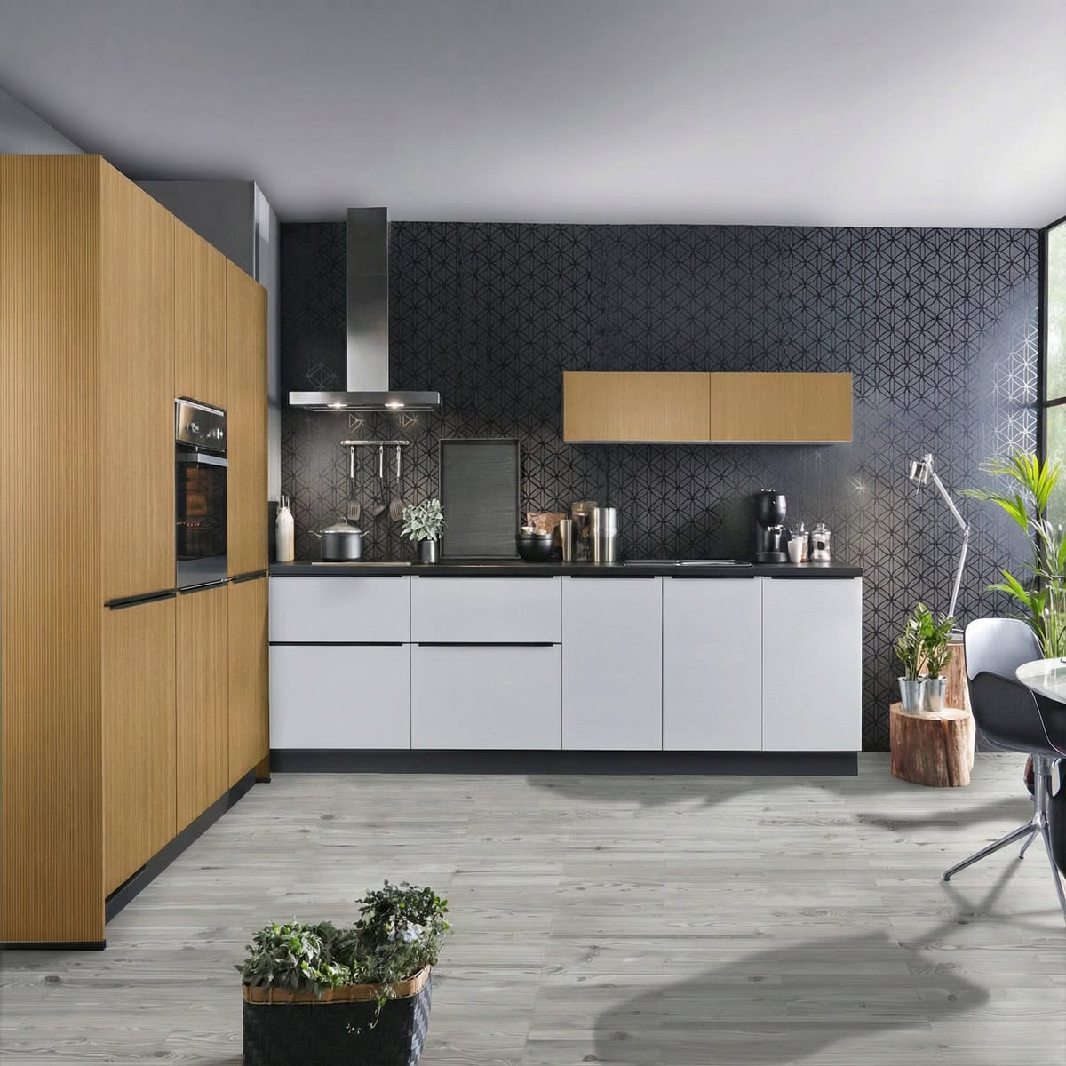 Az időtlen fehér és az világos tölgy mintás frontok játéka révén ez a konyha valóban figyelemfelkeltő.