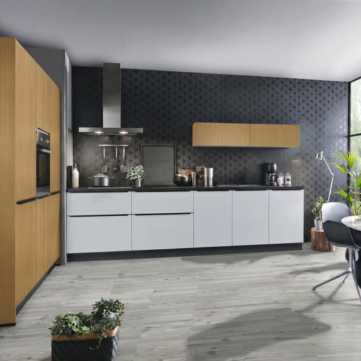 Ez a design-orientált konyha nem csak jól néz ki, de sok tárolóhelyet is kínál. A praktikus kihúzható szekrényekkel és a tágas magas szekrénnyel, amely Softclose rendszerrel van felszerelve.