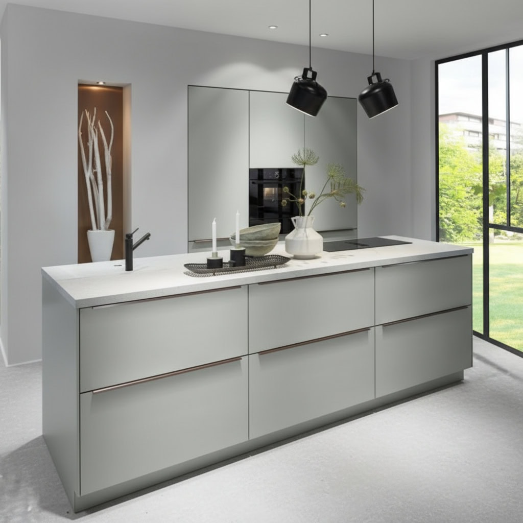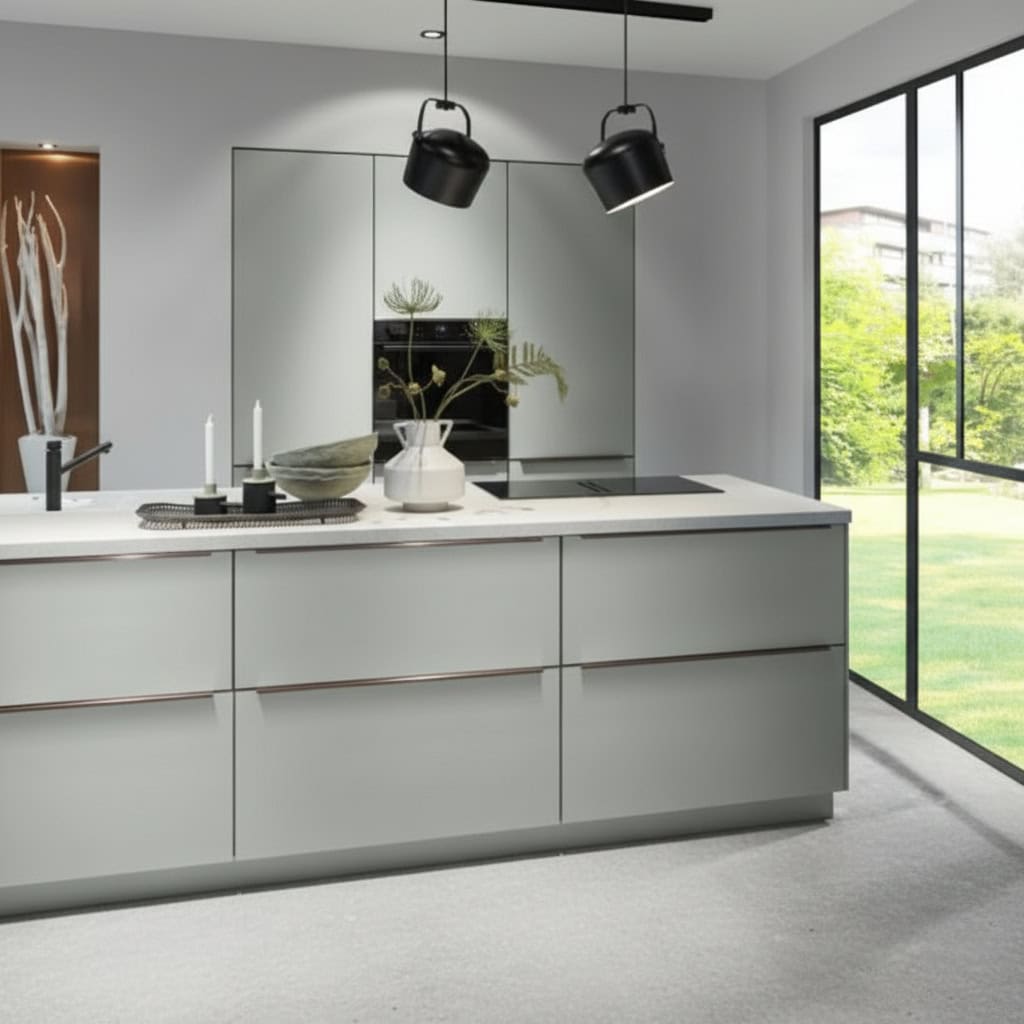 Ez a modern szigetes konyha a Jade trendi színében mindig magára vonzza a tekinteteket. A bronz színű fogantyúk és a munkalap betétjei nagyon luxus megjelenést kölcsönöznek és kiválóan harmonizálnak a barátságos zöld árnyalattal.