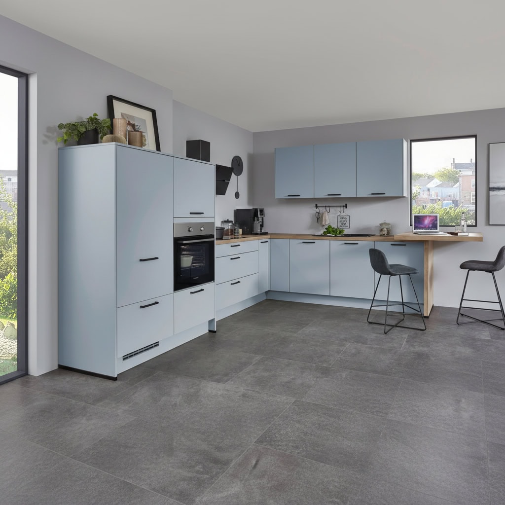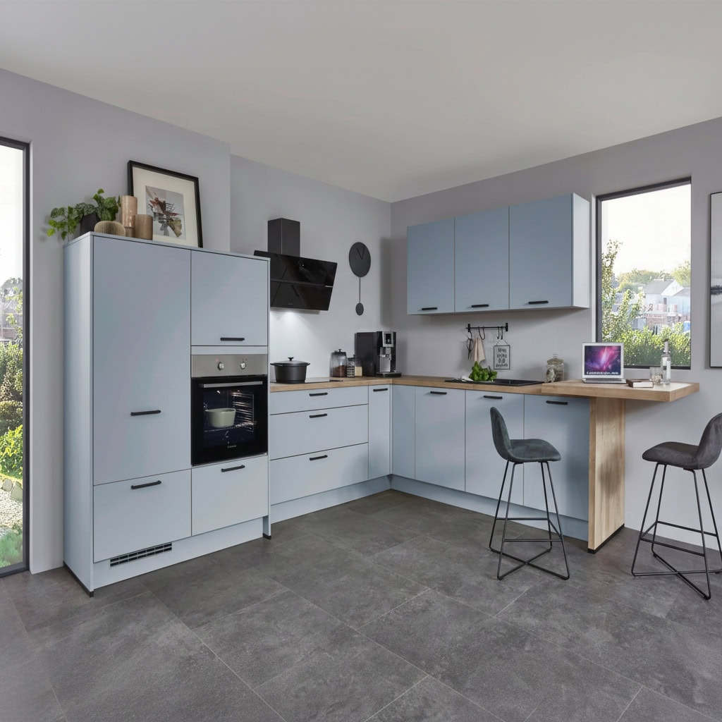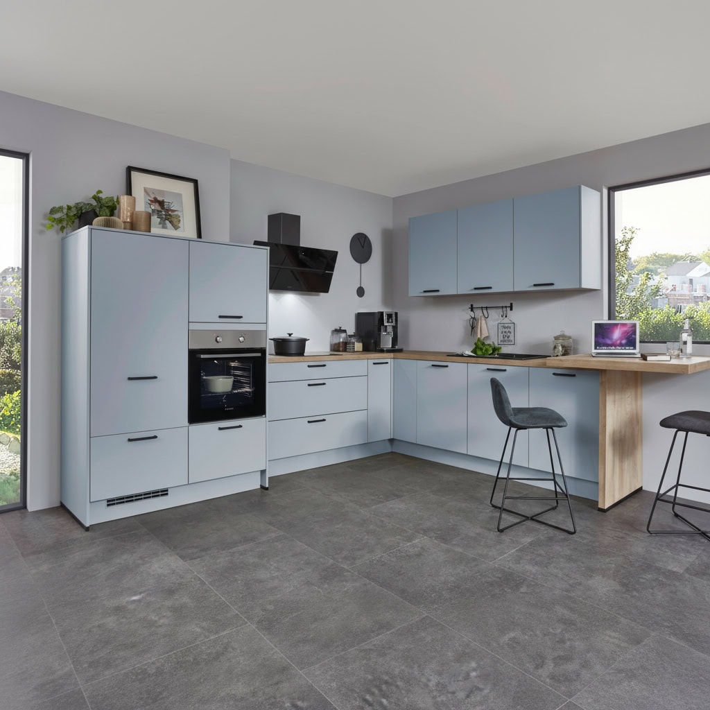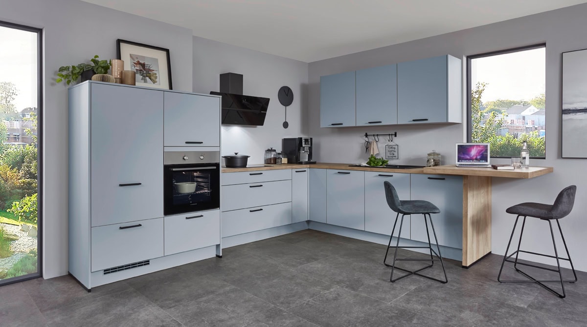 Ez a modern L alakú konyha ülőhellyel, meleg fa tónussal sok tárolóhelyet kínál, és garantáltan jó hangulatot teremt a friss Sky színnel.