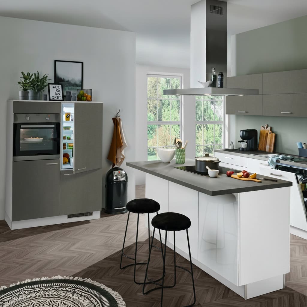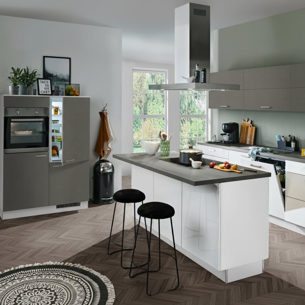 Diese moderne Inselküche ist alles, außer gewöhnlich. Die weißen Hochglanzfronten im Spiel mit dem Dekor Stahl dunkel wirken sehr luxeriös. Außerdem bietet diese Küche viel Stauraum und die kommunikative Theke lädt zu einem Kaffee, oder Frühstück ein.