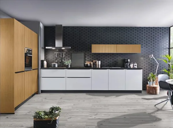 Durch das Designspiel vom zeitlosem weiß und den Rillenfronten in Eiche hell ist diese Küche auf jeden Fall ein echter Eyecatcher.